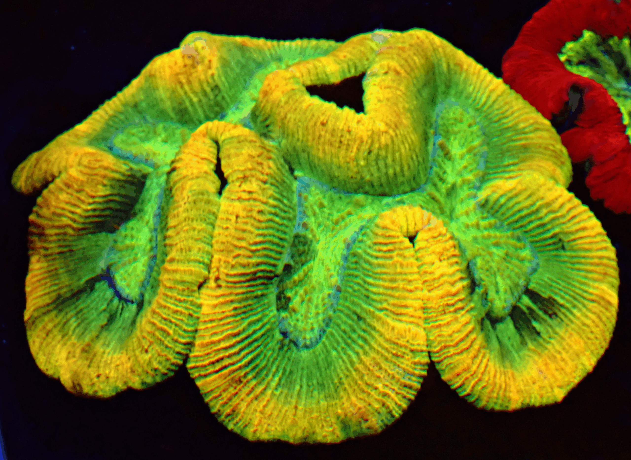 A stunning Trachyphyllia featuring a vivid yellow outer rim wrapped around a glowing green base with deep, sculpted valleys. The intense contrast and heavy flesh give this coral superb depth and presence.
