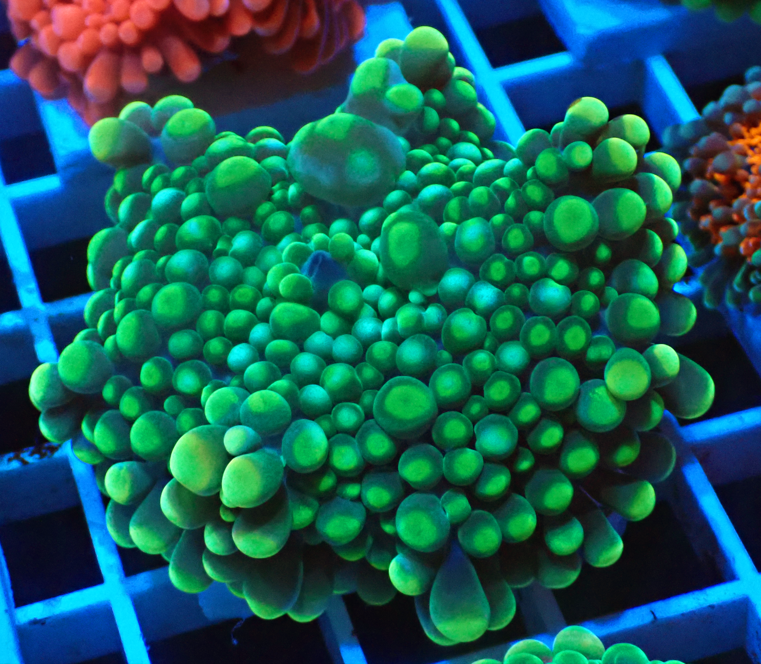 Photos taken under Radion Gen 4 Pro Blue spectrum using an underwater camera with lense. Please be aware that the corals colours may appear different under your aquariums lighting.