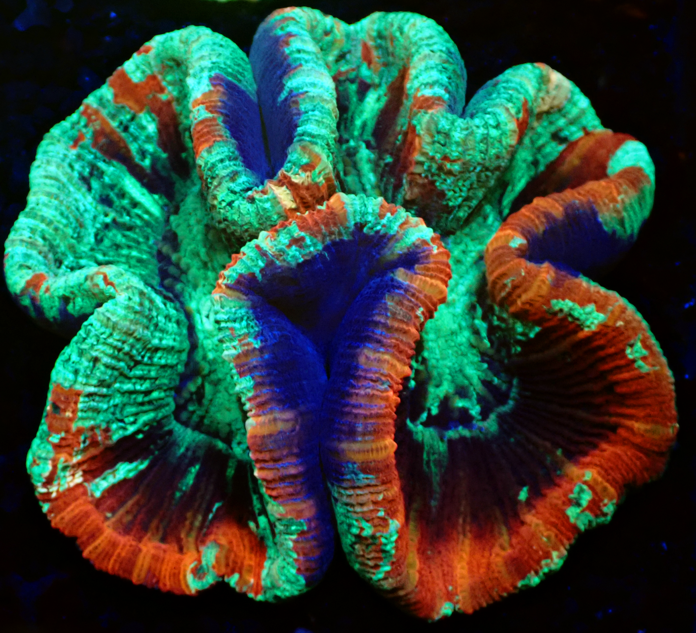 Photos taken under Radion Gen 4 Pro Blue spectrum using an underwater camera with lense. Please be aware that the corals colours may appear different under your aquariums lighting.