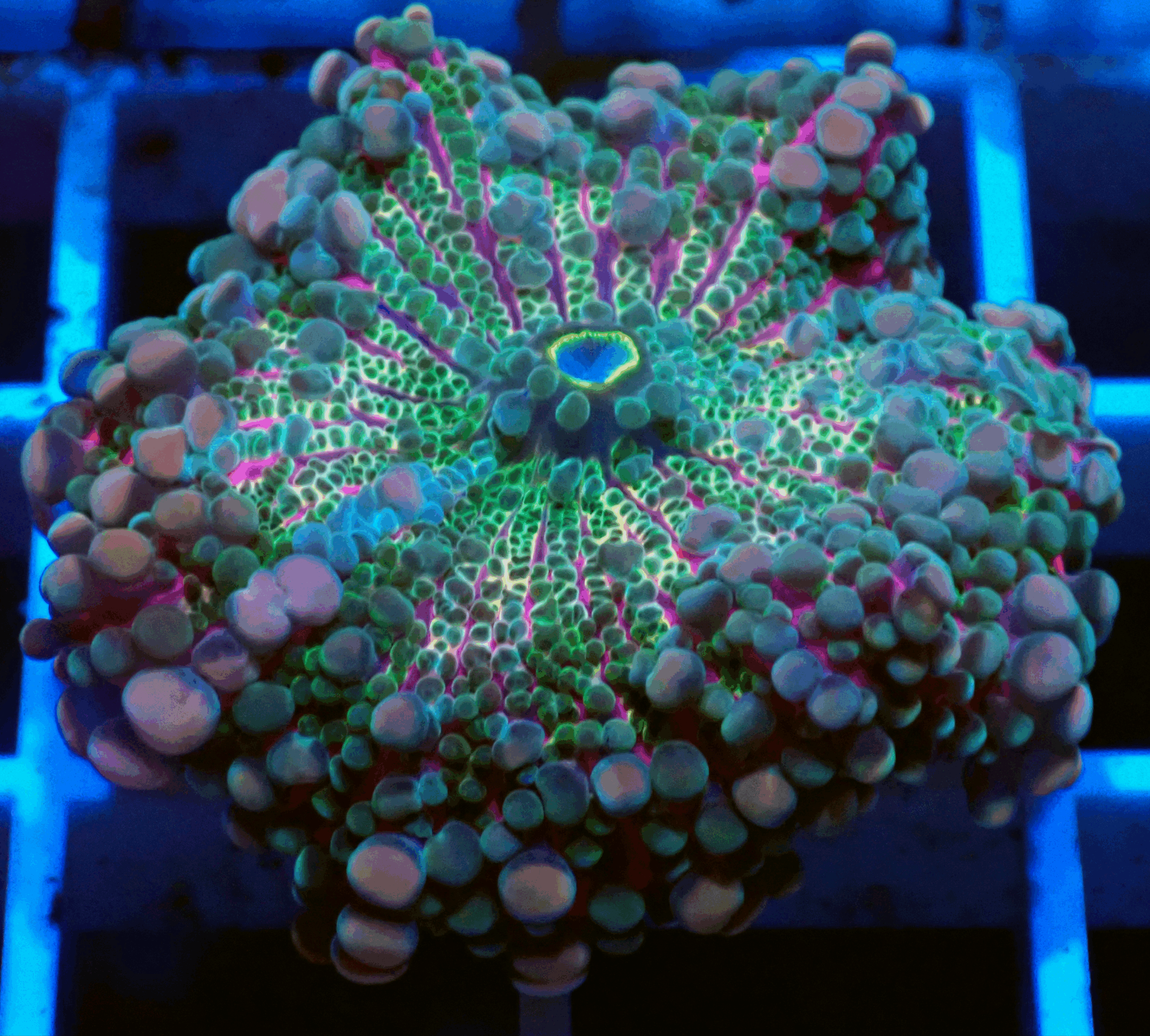Photos taken under Radion Gen 4 Pro Blue spectrum using an underwater camera with lense. Please be aware that the corals colours may appear different under your aquariums lighting.
