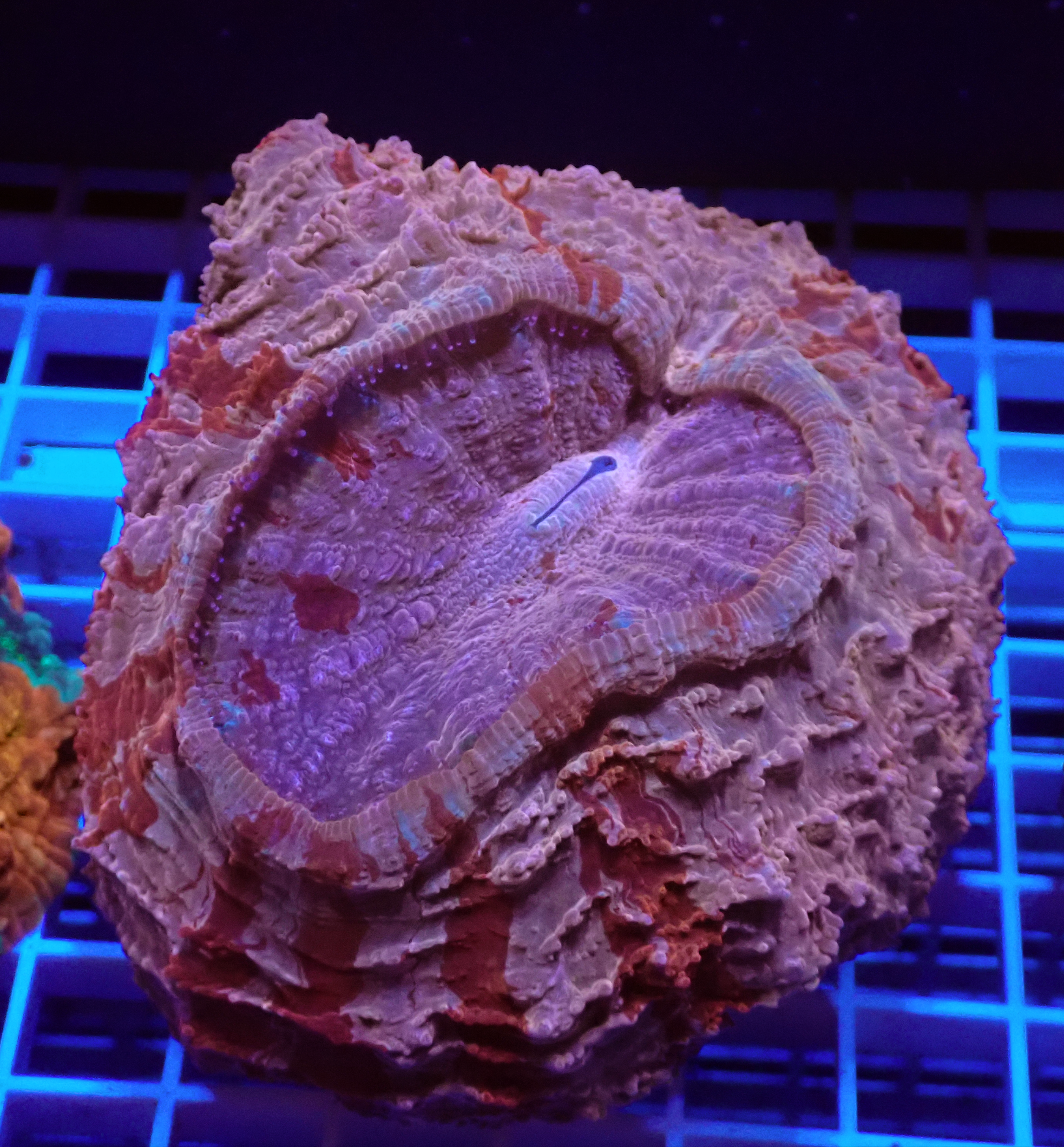 A gorgeous specimen displaying soft pink tones blended with rich red highlights and heavy, sculpted flesh. The intricate texture and natural colour variation give this coral real depth and presence under reef lighting. A premium Acanthophyllia perfect as a standout centrepiece in any LPS collection.
