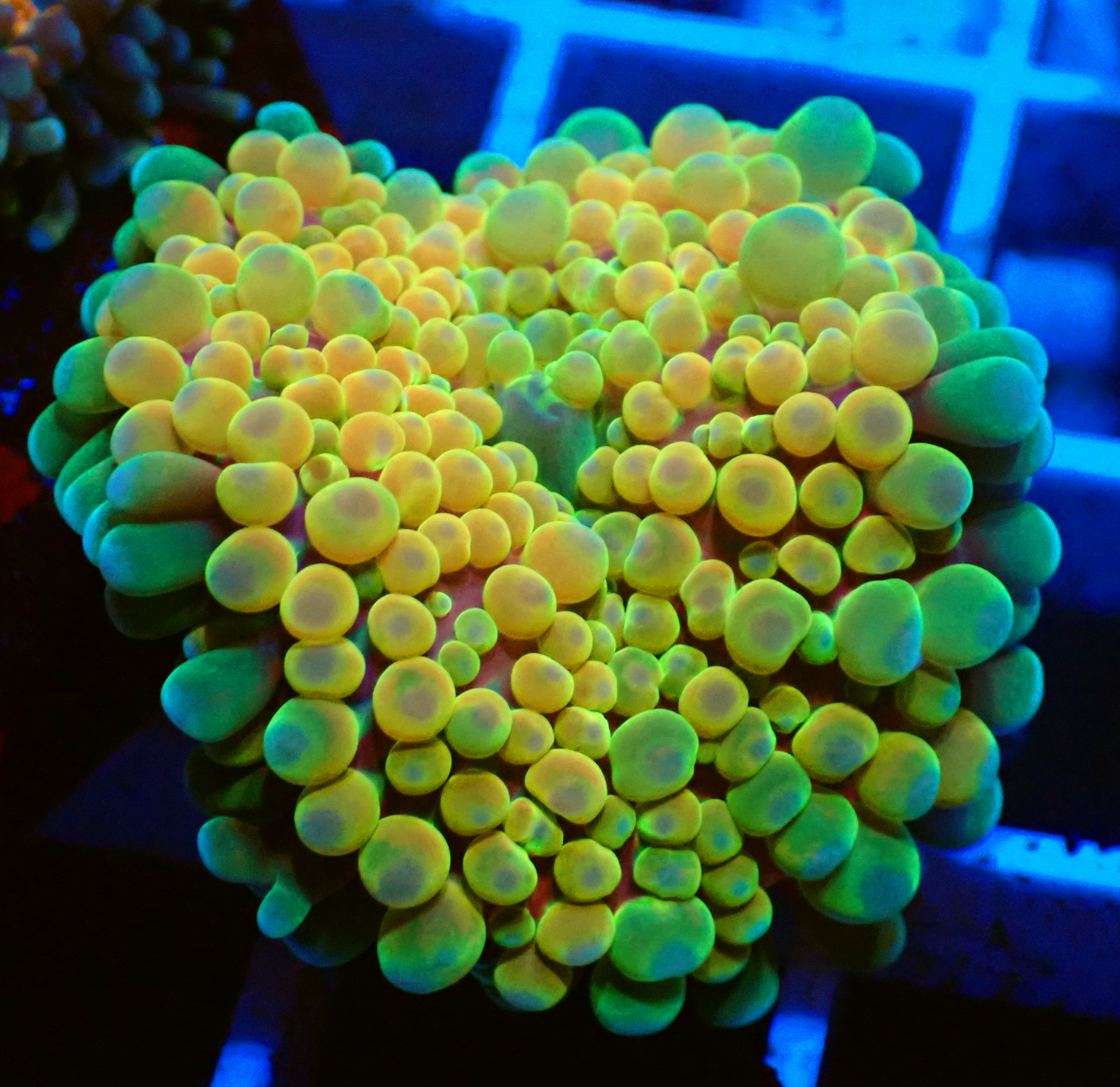 Photos taken under Radion Gen 4 Pro Blue spectrum using an underwater camera with lense. Please be aware that the corals colours may appear different under your aquariums lighting.