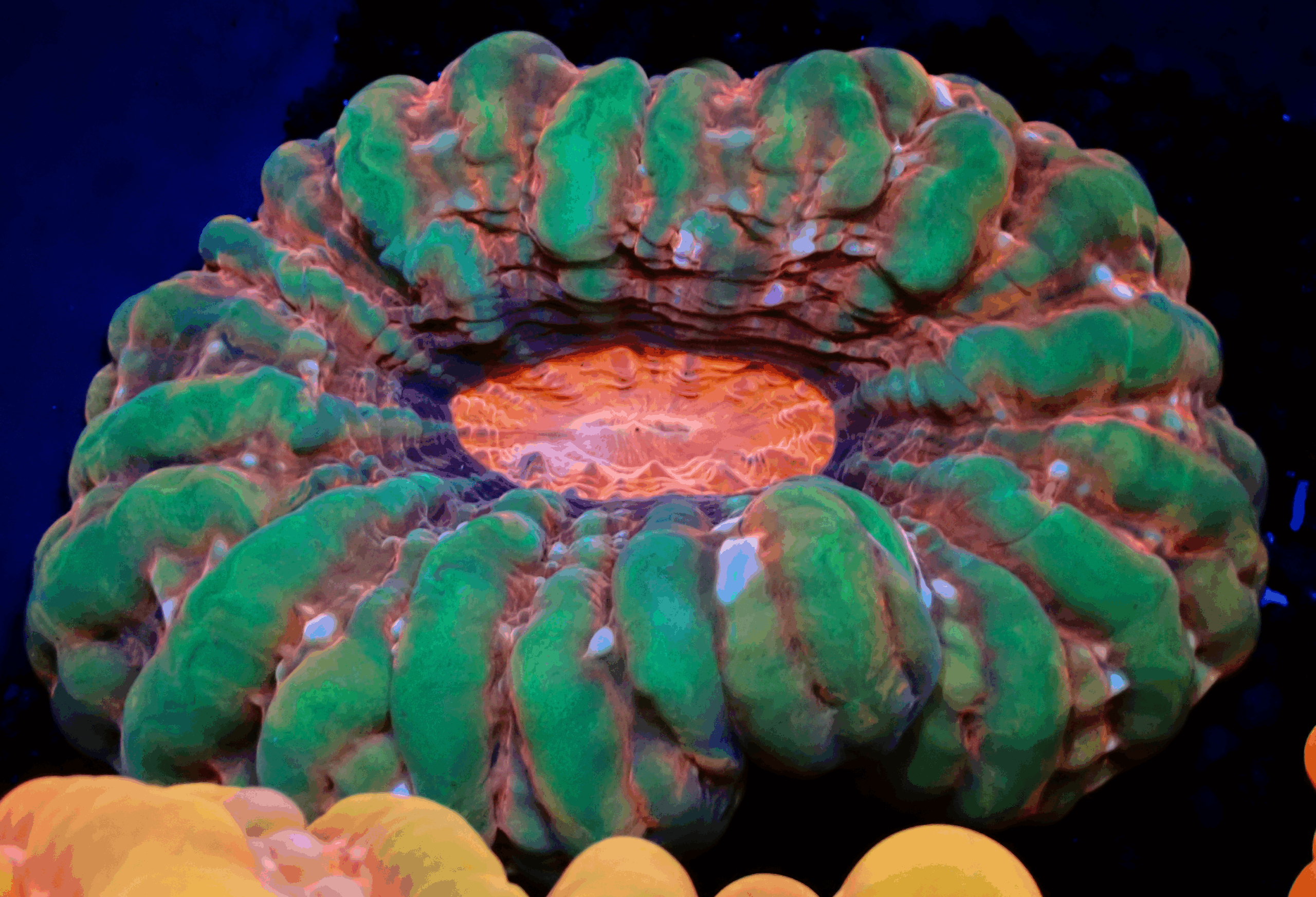 A genuinely exceptional specimen displaying a full spectrum of colour, with rich emerald greens, warm reds, and a glowing orange core flowing through its heavily inflated folds. The depth, contrast, and balance of colour make this a truly special Cynarina that stands out even among high-end pieces.