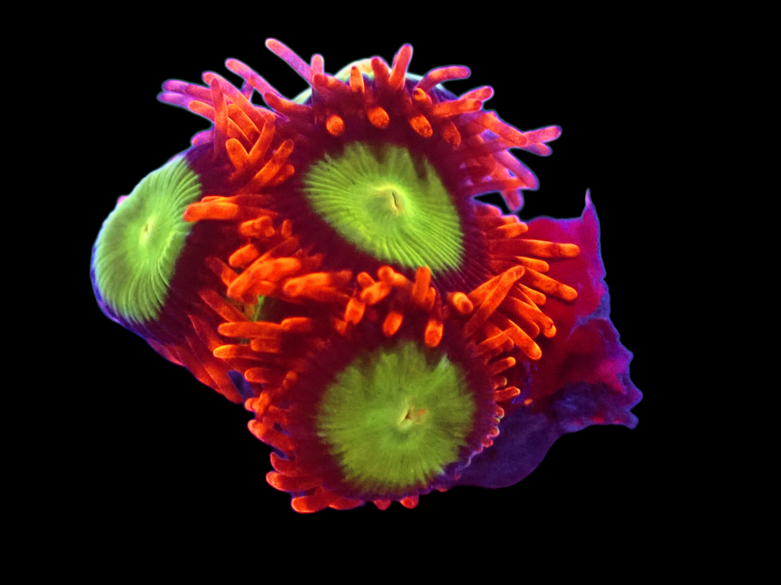 Photos taken under Radion Gen 4 Pro Blue spectrum using an underwater camera with lense. Please be aware that the corals colours may appear different under your aquariums lighting.